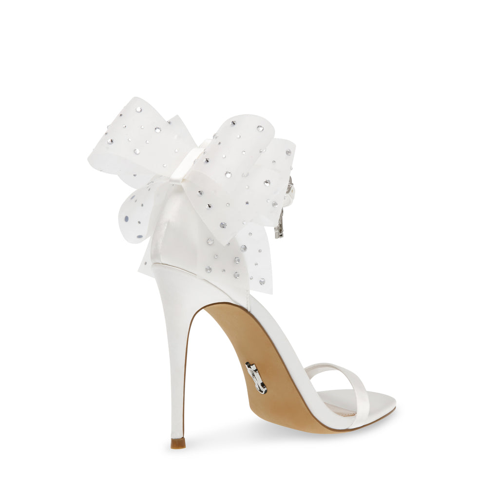 The NIKOLE sandal features a stiletto heel and a round toe, giving the design sleek lines that contrast with the voluminous bow at the back of the ankle.